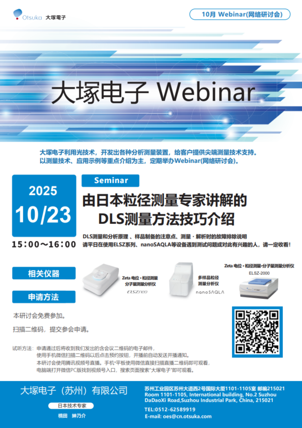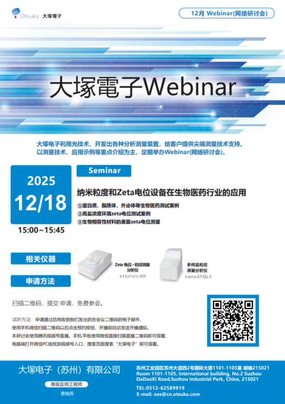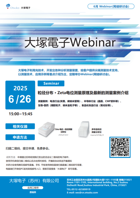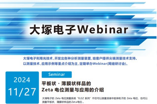 大塚電子的 Zeta 電位測量系統“ELSZ 系列”不僅可以測量溶液中膠體粒子的 Zeta 電位,也可以測量平板狀、薄膜狀樣品的 Zeta 電位。通過這樣的測量可以評價平板狀樣品的表面改質狀態以及液體中粒子的吸著特性。本次研討會將介紹其應用。